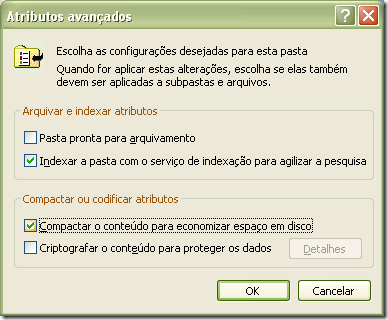 Escolha “Compactar o conteúdo para economizar espaço em disco e depois confirmar todas as telas clicando no OK. Ah, e lembre-se de mandar aplicar a compactação nas sub pastas.